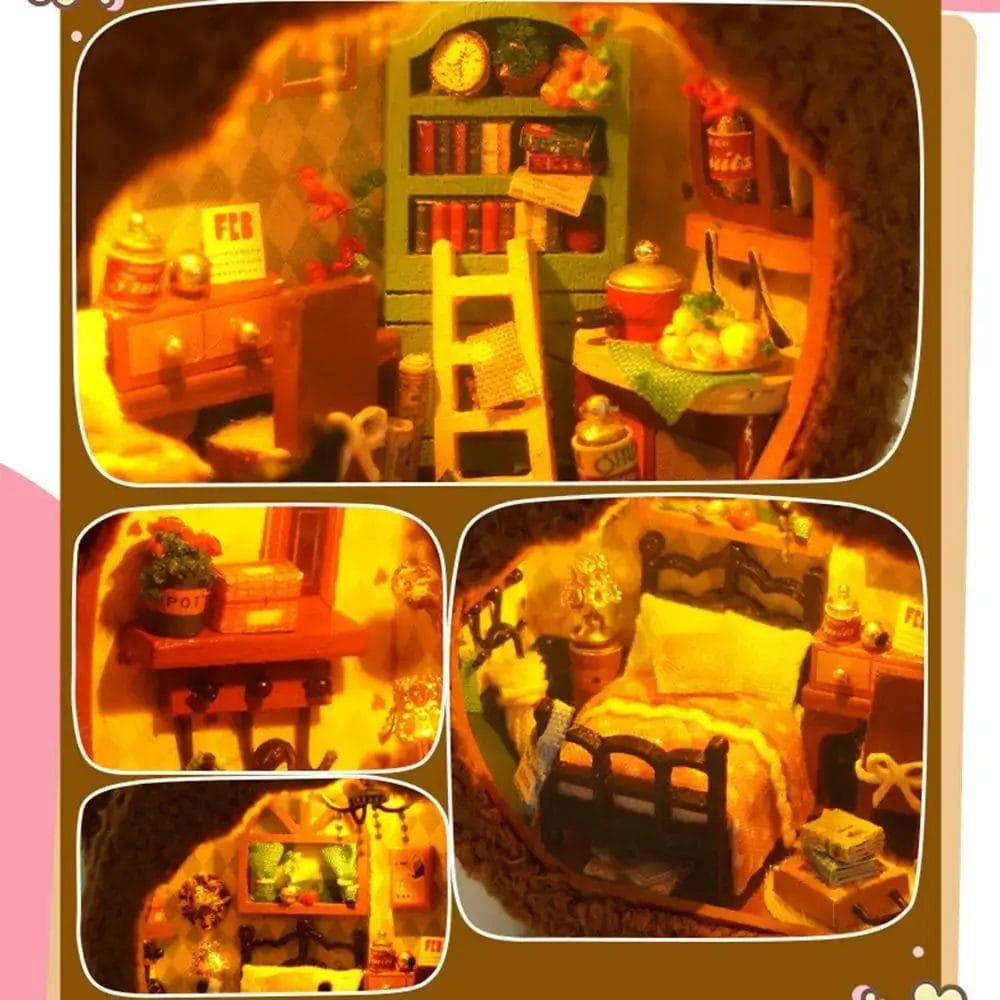 Handmade DIY Mini Wooden Dollhouse Warm Glow LED Lamp Small House Making Kit Plush Craftsmanship Cute Miniature Building Toys